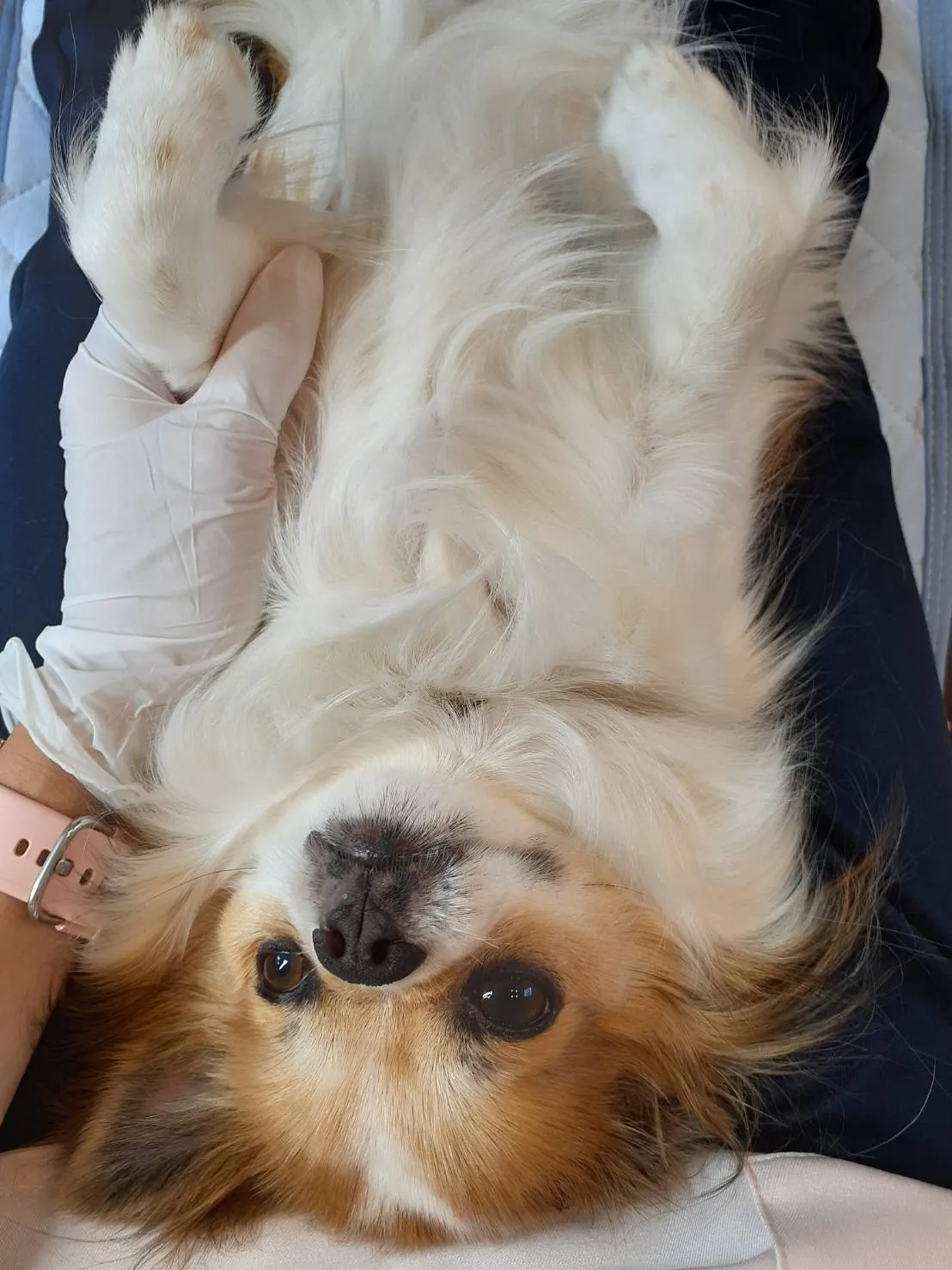 飼い主様よりワンちゃんをお預かりし、ワンちゃんとコミュニケーションを取りながら、両足の間で仰向けにゴロンと寝た状態にしてケアを行います。